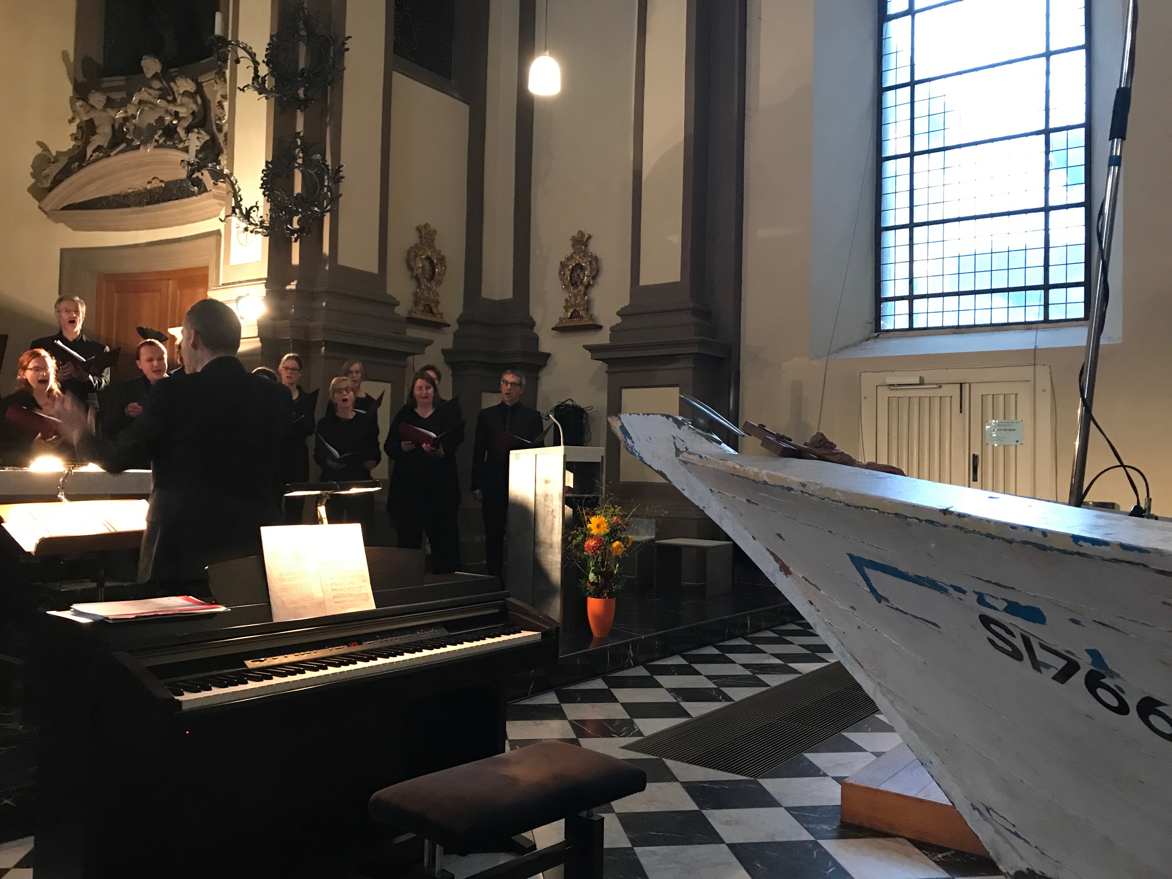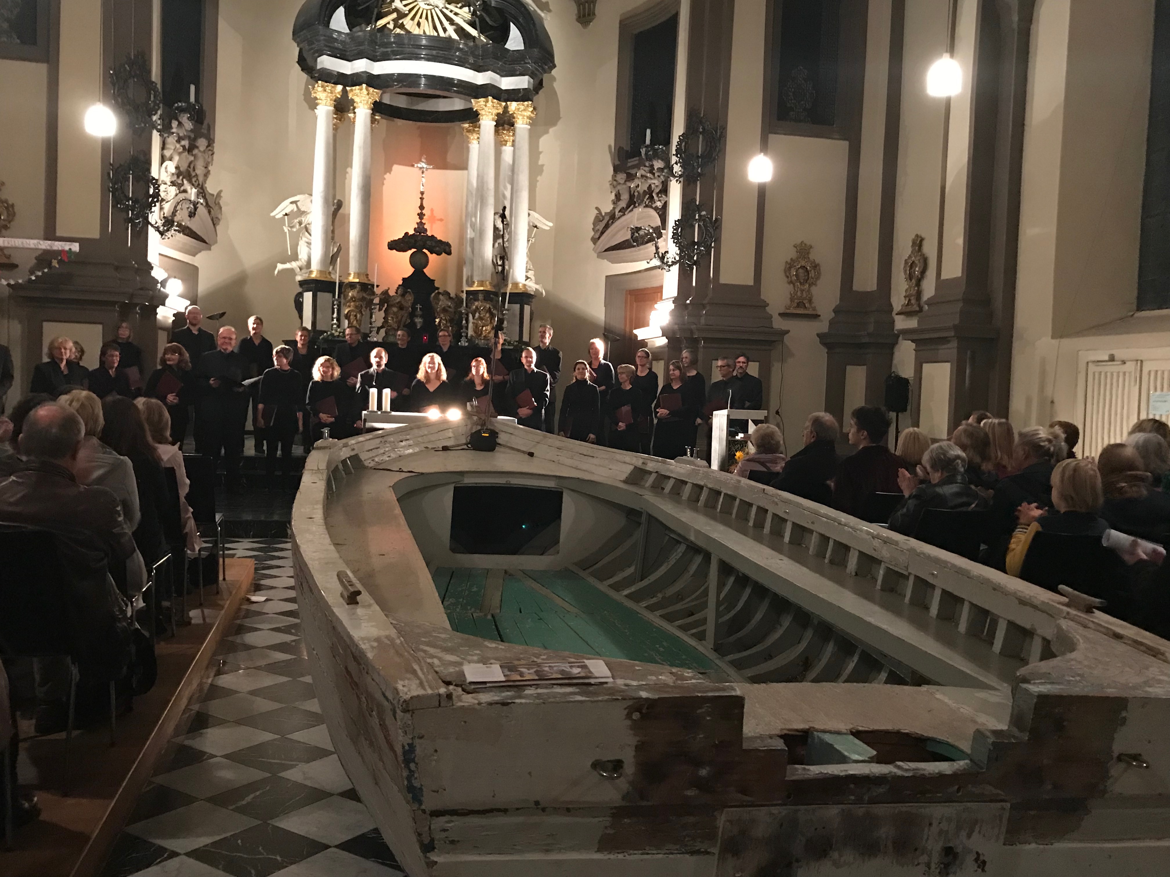 Sicherlich auch, weil schon das in der Kirche der Ursulinenschule aufgestellte Flüchtlingsboot Einen schlucken ließ. Dabei wollte ich doch einfach nur zum Konzert einer guten Freundin gehen. Schon im Jahr davor hatte der Kammerchor die Menschenrechte vertont. Und auch damals war ich tief beeindruckt.
