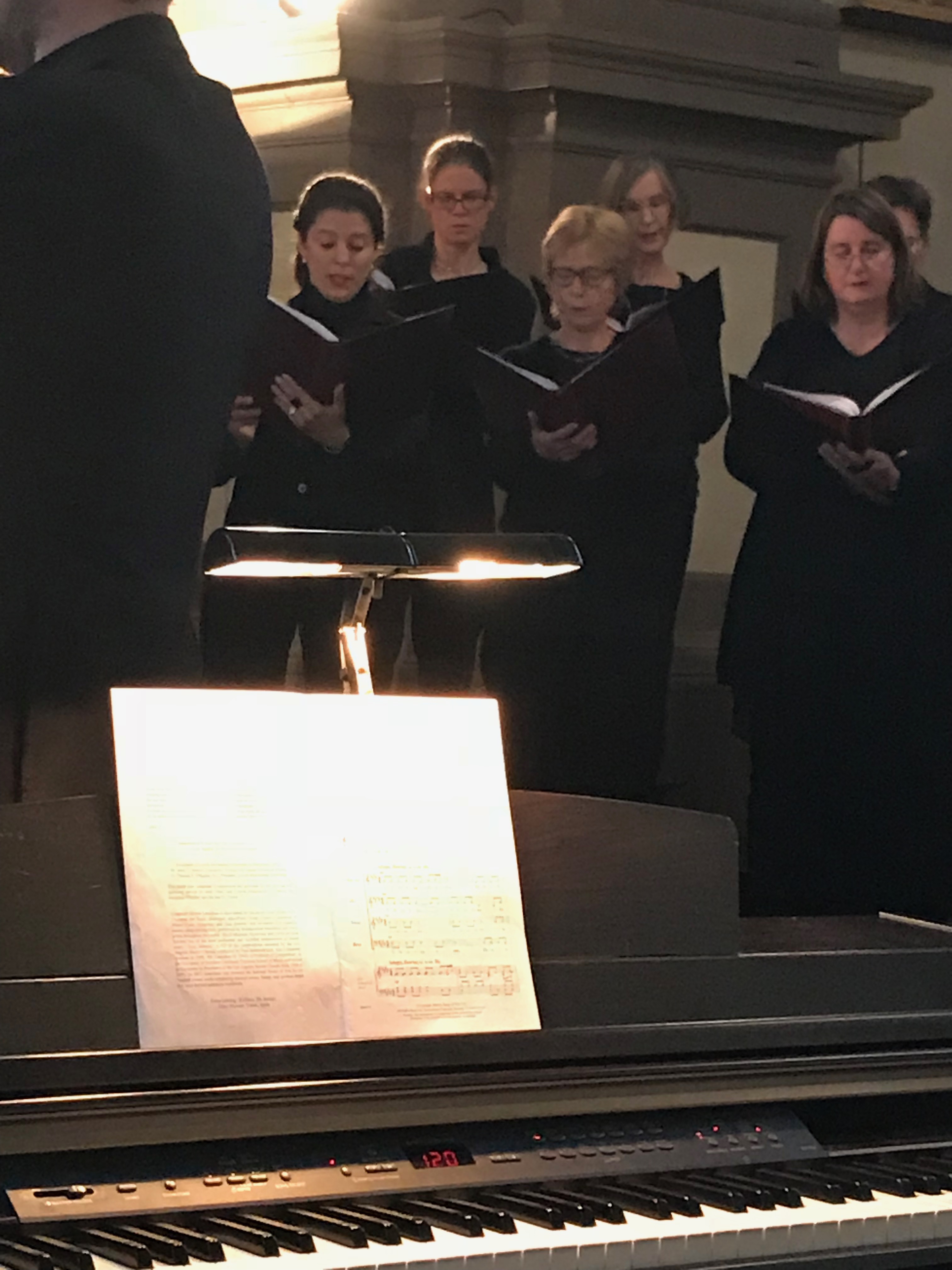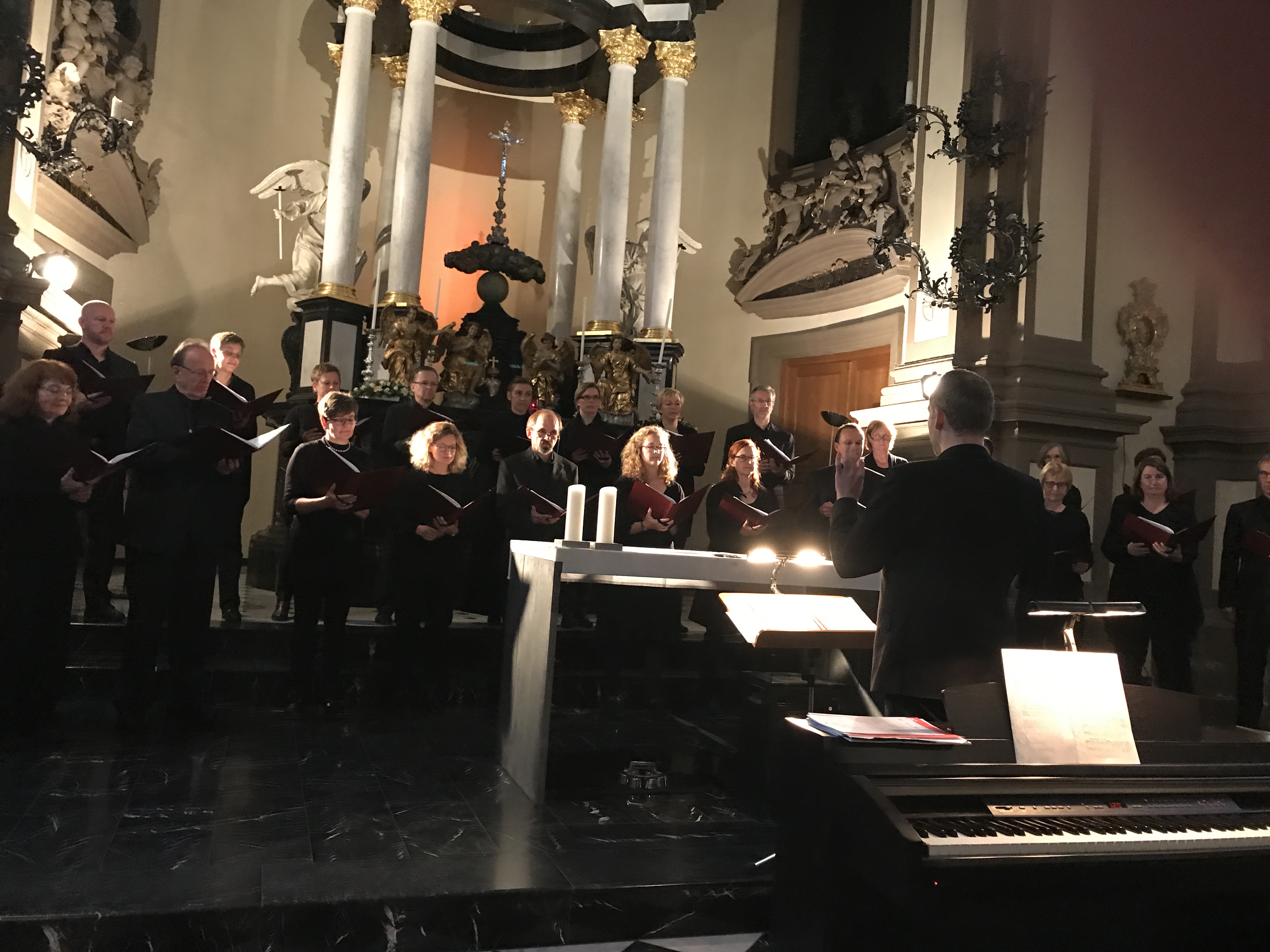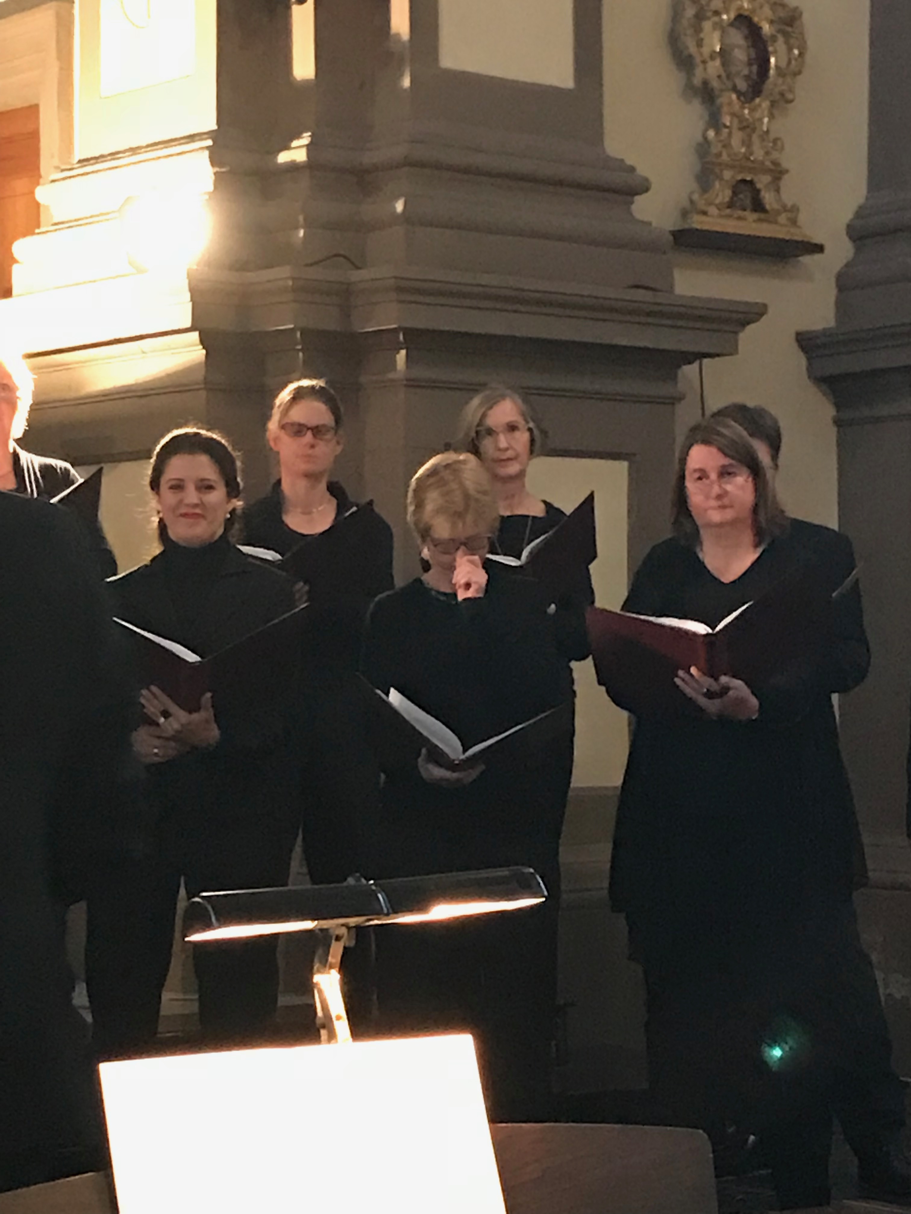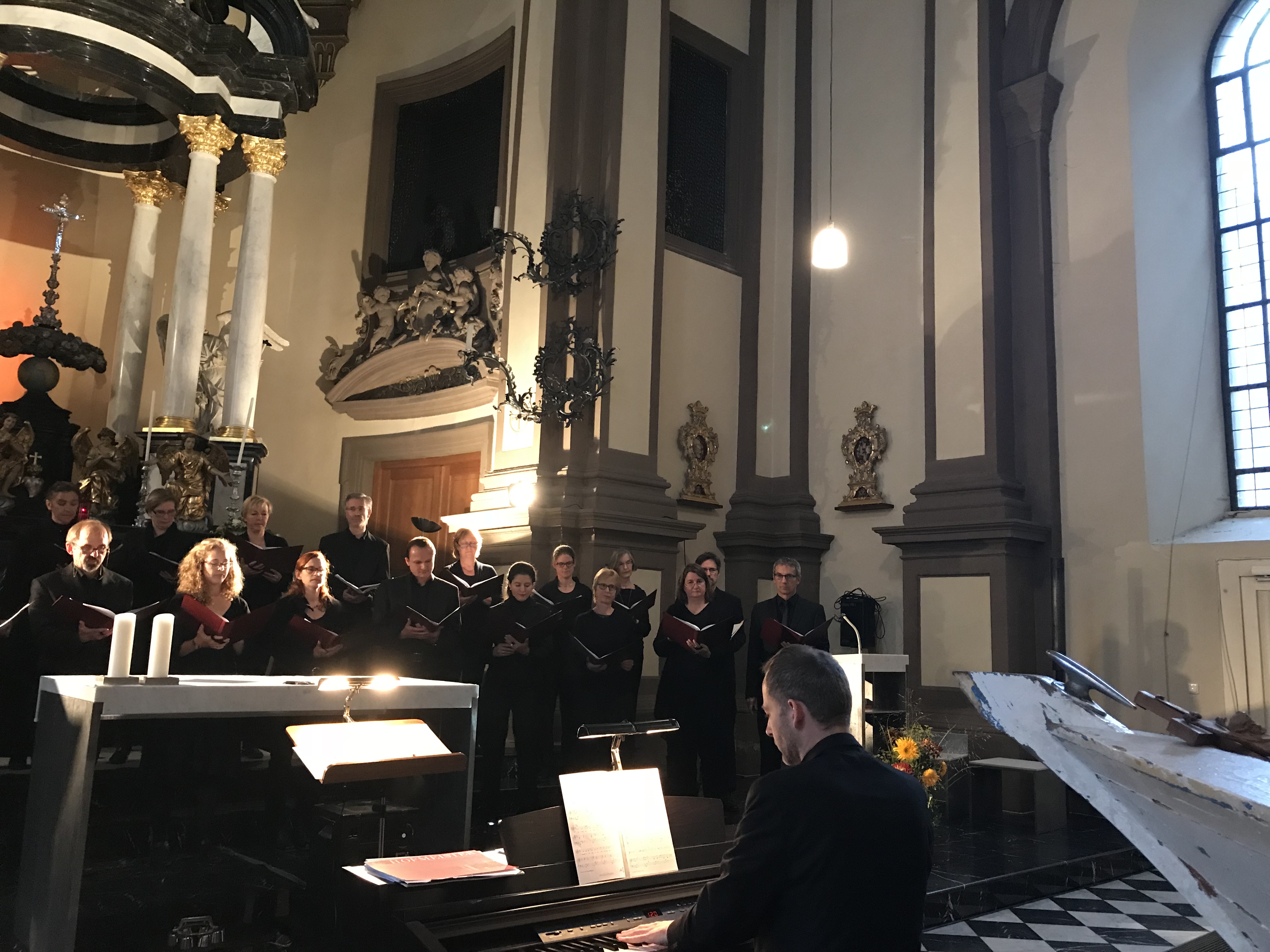 Cantamo hat für diese eine Aufführung an dem Programm seit Jahresbeginn geprobt. Die meisten Komponisten der Stücke leben noch. Übrigens: Kammerchöre gibt es ja mehrere in Köln – nicht jeder darf sich aber so nennen. Ein Kammerchor muss die vier Stimmen Sopran, Alt, Tenor und Bass aufteilen können. So können Stücke acht- oder 12-stimmig werden, also Sopran 1, Sopran 2/Alt 1 und Alt 2 usw. Bei der Aufführung wurde in gemischter Aufstellung gesungen, was so eigentlich nicht üblich ist, da zum Beispiel bei Bachkantaten die Stimmen zusammenstehen. Hier war in der ersten Reihe immer Sopran1/ Sopran 2/Tenor1/ Tenor 2 – hintere Reihe Alt und Bassstimmen im Wechsel. Der Chor probiert im Vorfeld aus, wie die Stücke sich am besten in ihrer musikalischen Kraft entfalten. Noch besonders an Cantamo: Die „Melodie“ wird nicht besonders geübt. Denn Voraussetzung ist, dass alle die Noten vom Blatt singen können. Geübt werden nur schwere Stellen und in den Proben erarbeitet man den Ausdruck, die Lautstärke, was fordernd klingen soll oder lieblich usw.