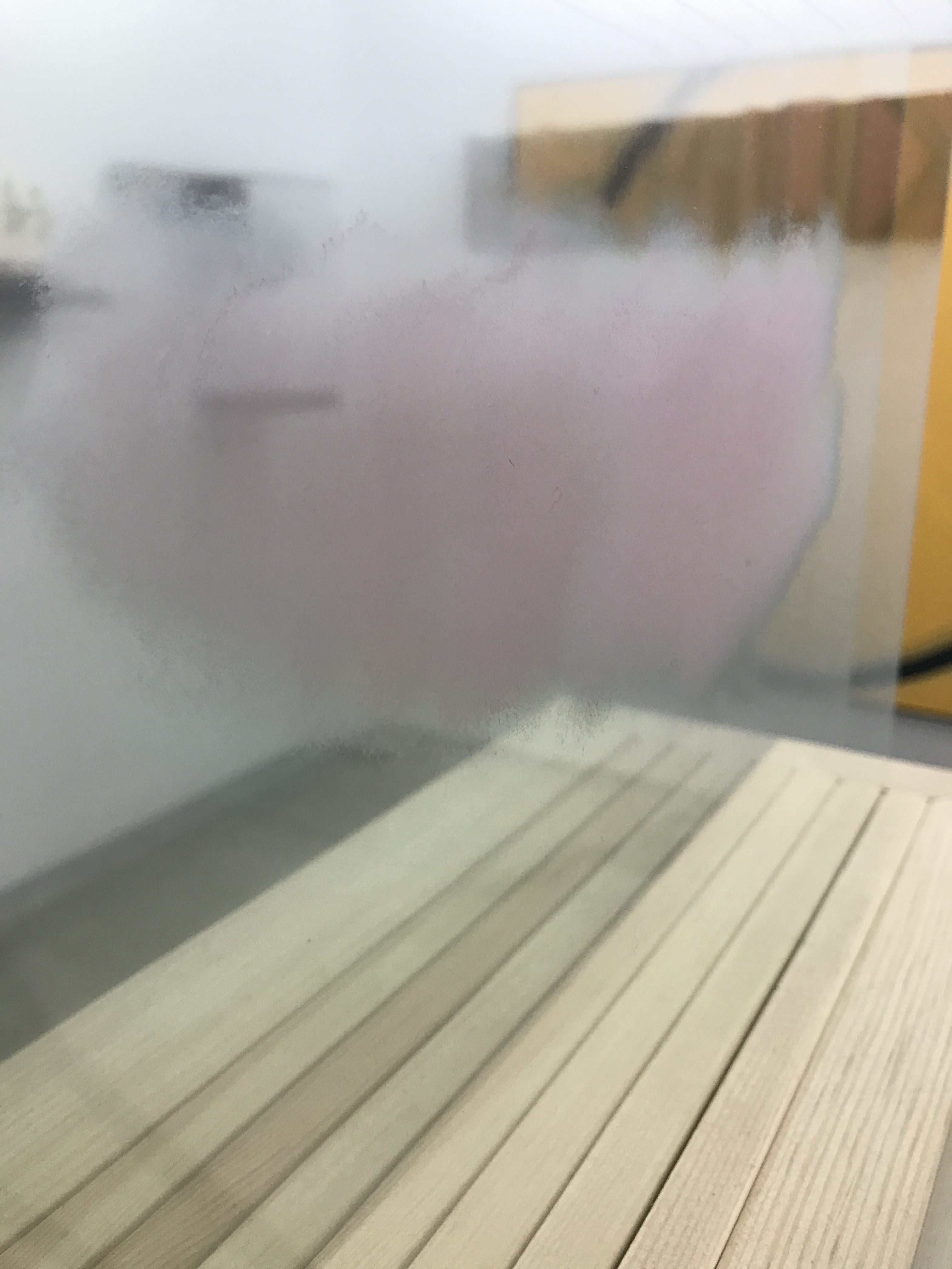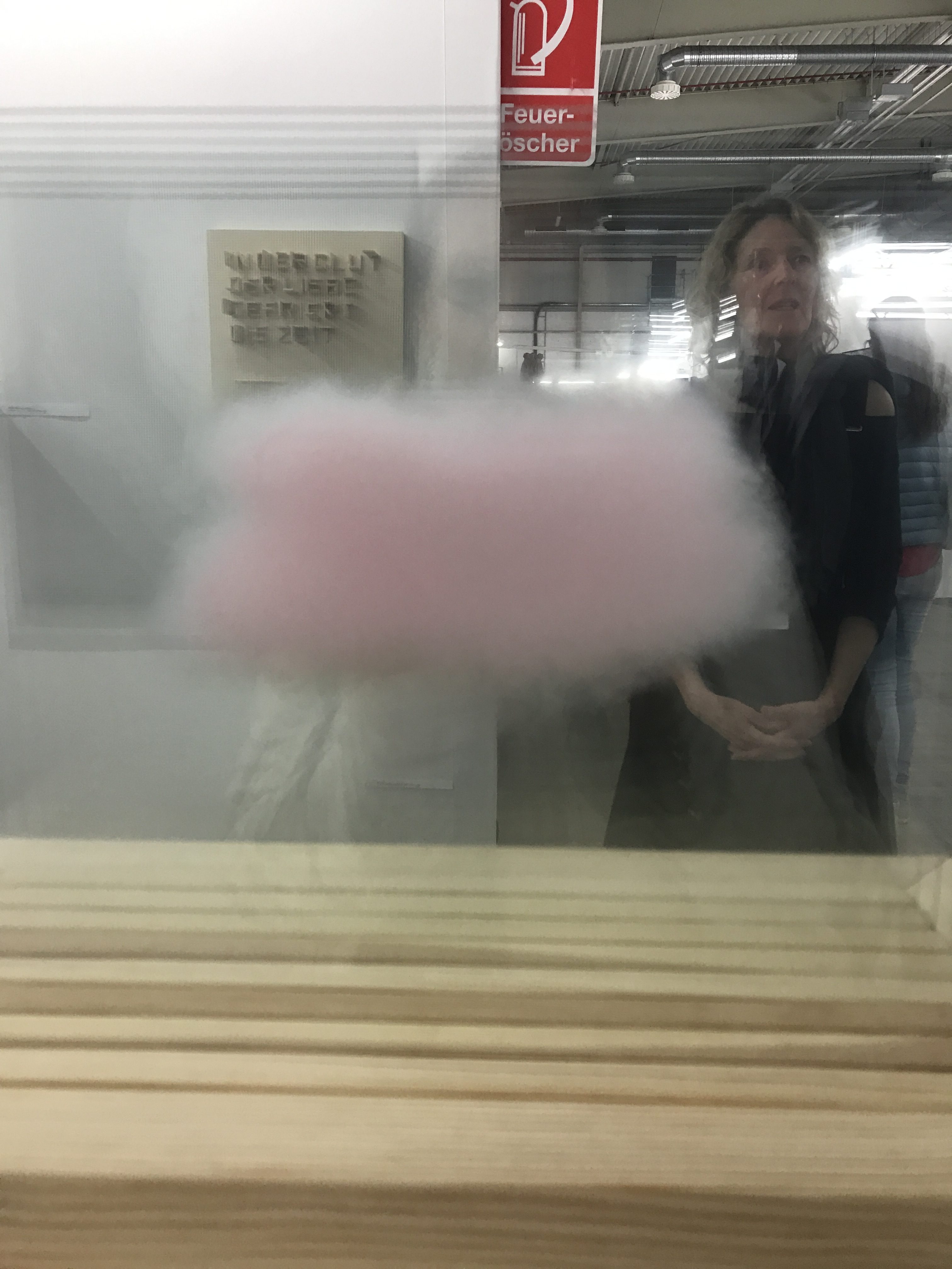 Aber es war nicht nur (philosophisch) schwere Kunst zu bewundern, sondern auch wolkenleichte…. So schön! Ist es nicht irre, dass es aussieht, als sei einfach nur ein Wattebausch zwischen die Scheiben geklemmt worden? Dabei sind es sieben Scheiben mit unterschiedlichen Ausschnitten der Wattewolke! Auch hier fehlt mir der Name der Künstlerin, aber ihr seht sie im Hintergrund des ersten Fotos. Ich reiche den Namen so schnell wie möglich nach!