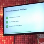 Robert Weller vom Blog toushenne (tuschän ausgesprochen) begeisterte mit einer Darstellung, was für ihn Content Design bedeutet. Klasse, die Demonstration, wie einfach wir über entsprechendes Design auf einer Website gesteuert werden. Spannend auch die Schilderung, wie ein Content-Design-Prozess ablaufen könnte. Letztlich fand ich toll, dass es hier mal nicht nur um Zahlen, Conversions und Leads ging, sondern auch einmal der Contentprozess selbst im Mittelpunkt stand.