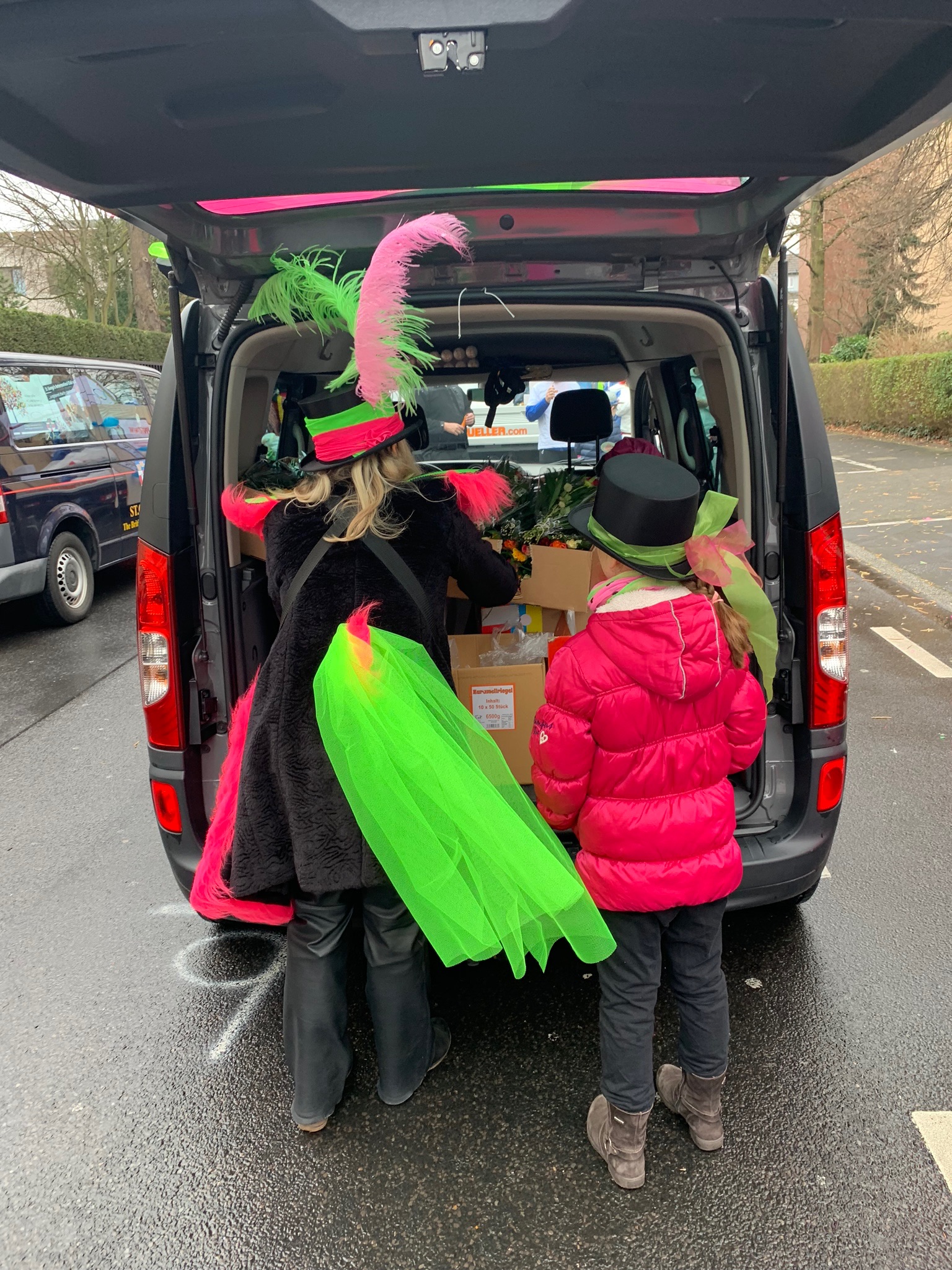 Nur noch zur Anmeldung und schon ging es fast los! Dachten wir! Aufgrund von verstärkten Sicherheitsmaßnahmen durften wir noch vier Wagenengel und zwei Ordner organisieren. Also sechs Ordner bei zehn Teilnehmerinnen. Fürs nächste Jahr haben wir übrigens schon jetzt mehr als doppelt so viele Anmeldungen… (Yes!) Jedenfalls mussten jetzt auch noch Wagenengel und Ordner her. Wir hatten Glück, weil sich schon nach zwei Stunden auf unserem Aufruf vier Mädels meldeten. Denen ich an dieser Stelle nochmal danken möchte! Ihr habt das toll gemacht! Die Ordner fanden sich dann in meiner besten Freundin, die ein Rosenmontagszugprofi ist, und dem Ehemann einer Lady.
